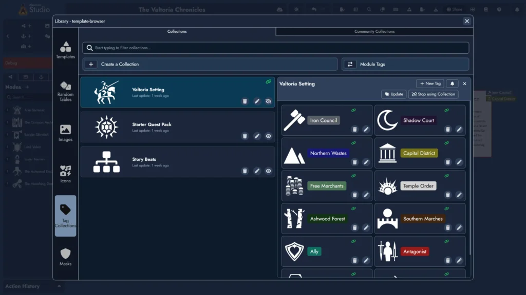 - Create Collections in the Library’s Tag Collection Manager, accessible from both the Lobby and inside any open Module. Each Collection has its own name, optional featured image, and a set of Tags you can add, edit, or remove at any time.
