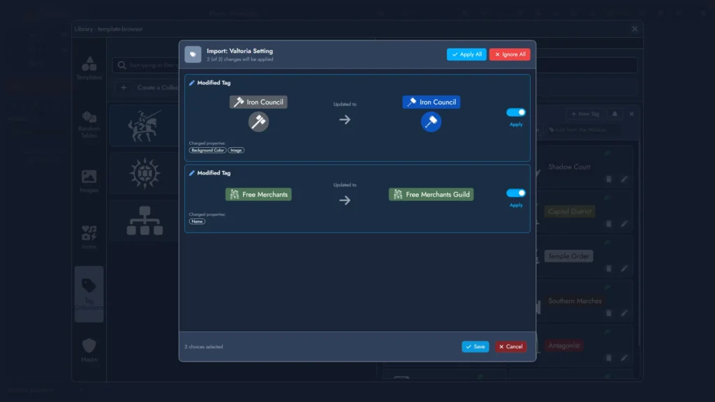 Tag Collections let you build reusable sets of Tags in your Library and import them into any Module. Imported Tags stay connected to their source Collection, so when the Collection is updated, you can review and apply those changes across every subscribed Module.